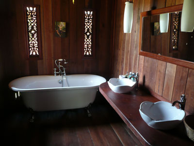 There are 10 traditional Khmer wooden houses that are designed to recreate an old style Cambodian village. Each has a ceiling fan, mosquito net and ensuite bathroom. Electricity is generated by the resort, so can be variable and only operates for part of the night.