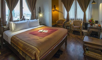 The 29 rooms are dominated by the traditional dark wood furnishings and are designed to reflect the strong artistic traditions of Mandalay, from the bronze wall lamps to the teak bedstead. All are air-conditioned with safety deposit box, wifi and ensuite bathroom.