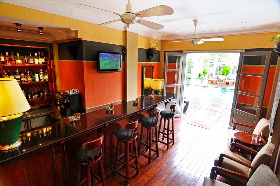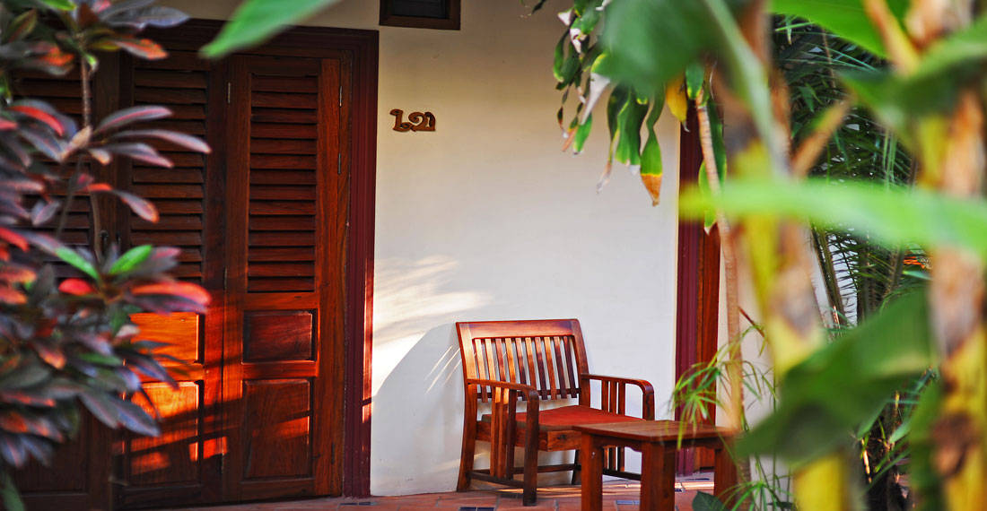Rooms are relatively small but comfortable with french doors opening onto the beautiful tropical courtyard garden. Each is appointed with local artisan made terra cotta tiling, woven silk and carvings. Each has air-conditioning and fans, safes and free WiFi.