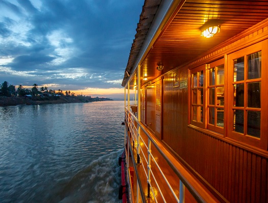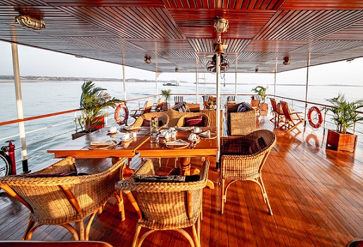 A gong summons passengers to the dining room for meals featuring locally sourced specialities from each country and is air-conditioned or open windowed depending on weather conditions.