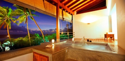 This boutique hotel has a collection of 27 suites housed in two-storey chalets located on both sides of the rocky headland, providing spectacular ocean views. Each is designed to give a sense of privacy and seclusion with roomy interiors that have a tropical modernist feel and boast split level timber-floored bedroom / lounge areas plus semi-open bathrooms. All have air-conditioning, ceiling fans, satellite TV, Wi-Fi, mini bar and safe. Some of the deluxe suites have private swimming pools with breath-taking views of the ocean.